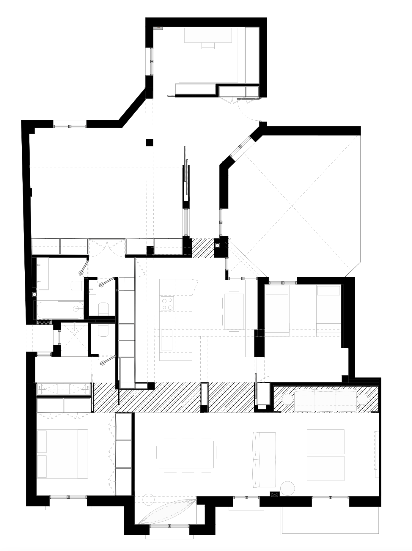 Este apartamento situado en el barrio madrileño de Chamberí fue totalmente demolido, manteniendo solamente la estructura original de pilares de hormigón. Para aportar orden en la zona donde la estructura estaba más desalineada, se recurrió a un módulo central que contuviese todas las instalaciones de climatización y calefacción así como los elementos verticales de la estructura. Este módulo de madera, entendido como un mueble, a su vez nos serviría para ampliar la zona de estancia albergando el sofa, contener y ocultar las puertas de acceso a otros espacios, marcar una separación entre la cocina y la sala de estar – comedor y conformar el lavabo del baño principal. En cuanto a los materiales, se ha recurrido a la madera principalmente en este módulo para darle potencia, marcándose también el volumen en el pavimento. En toda la vivienda se decidió renovar el suelo de azulejo hidraúlico pues, aunque hubo que cambiarlo debido al mal estado, se consideró que por el tipo y época de la construcción tenía sentido mantener el mismo tipo de pavimento.