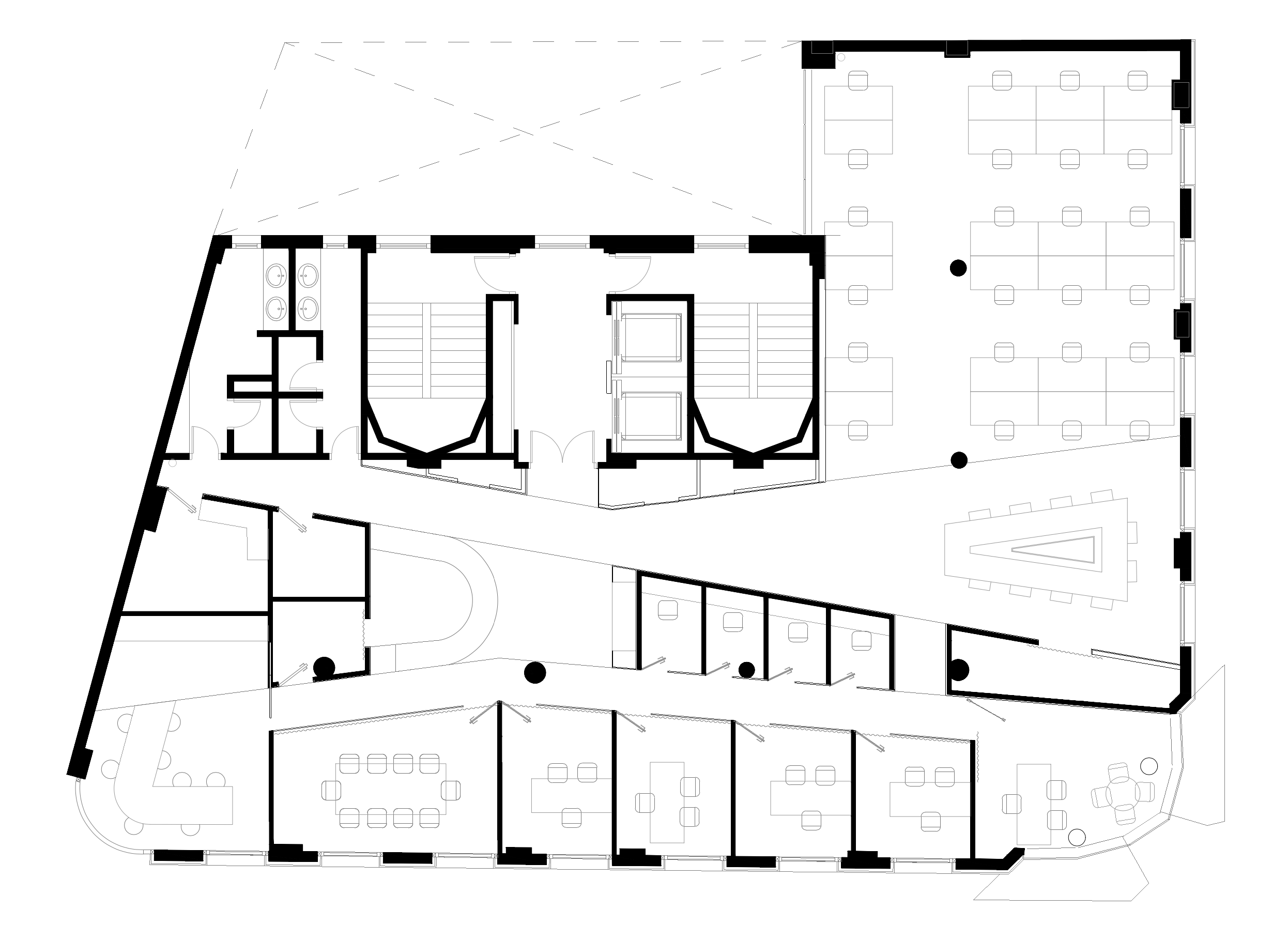 Socios.com buscaba con su nueva sede en Madrid crear un estilo de oficina que representase el espíritu de la marca. Se ha procurado mantener un estilo sobrio pero incorporando algunos elementos que permitían suavizar la seriedad aportada por los materiales elegidos y los colores corporativos, acercándonos también de forma sutil al mundo del deporte. La situación y vistas privilegiadas del espacio, dominando la Plaza de España de Madrid, llevó a posicionar tanto despachos como zona de open o!ce en fachadas mientras que el resto del programa se recoge en dos volúmenes contundentes, que ignoran por completo la estructura del edificio ayudándonos con esto a generar circulaciones inesperadas pero que ayudan al programa y funcionamiento de la oficina.