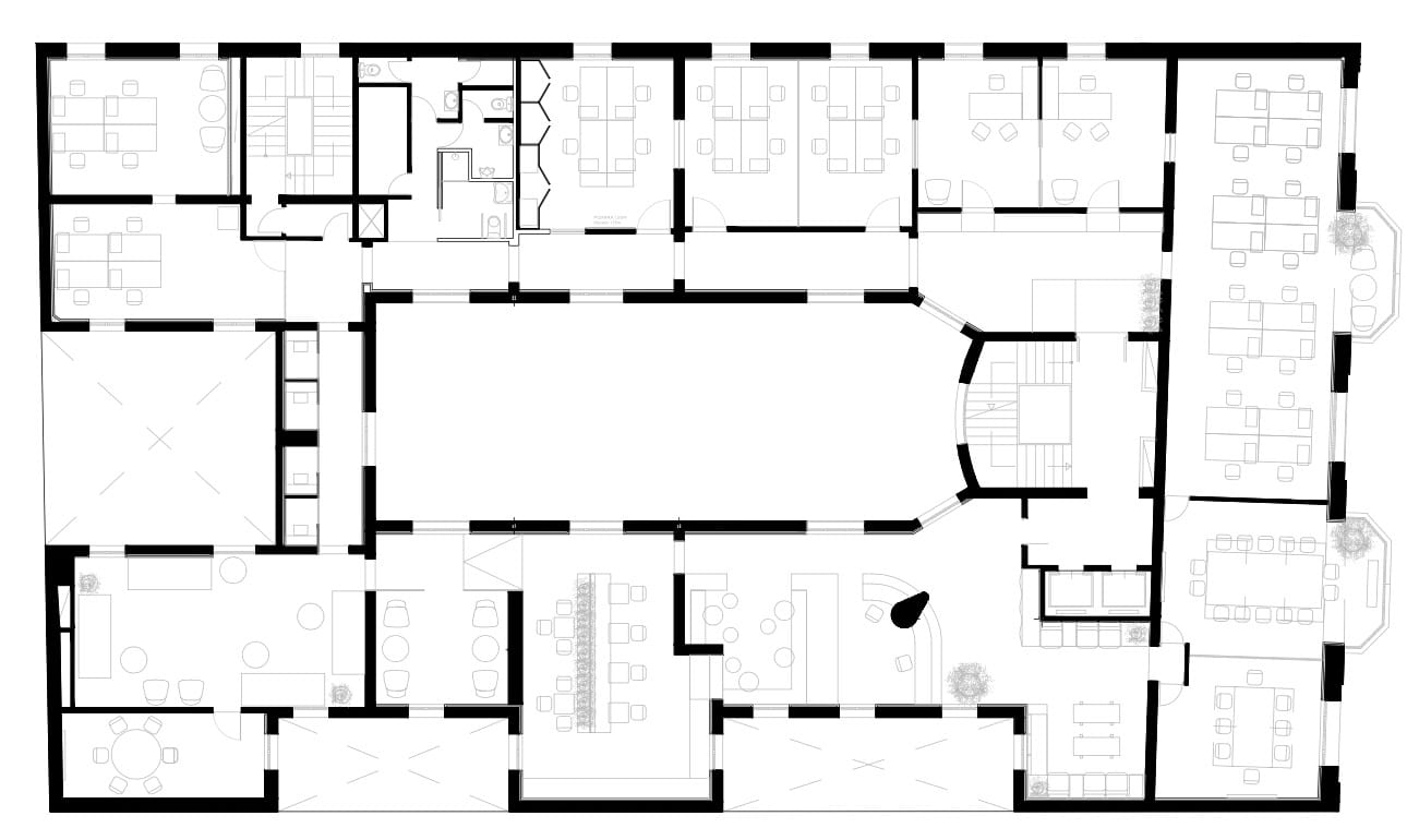 o de reunión. La distribución ha estado condicionada por la estructura del edificio y se ha buscado aprovechar los espacios residuales con zonas para llamadas o pequeñas reuniones express. En cuanto a la materialidad, siguiendo el brief del cliente, se ha intentado mantener un balance entre los materiales más sobrios y el rojo corporativo, utilizando como elemento unificador el granate, presente en todo el proyecto.